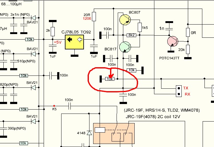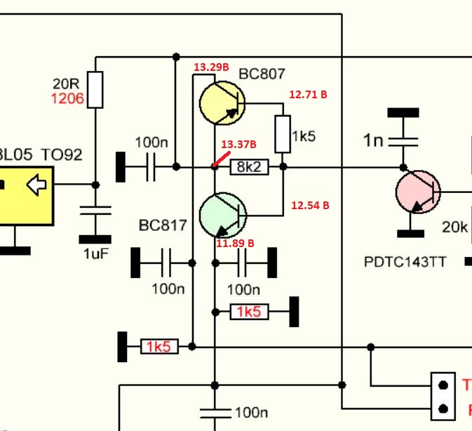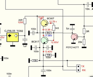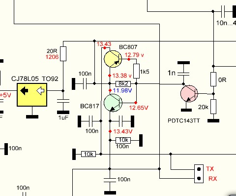 Дай сетку напряжений как выше, но уже для RX и ТХ режимов. Что происходит с тнми же напряжениями при удалении 143. Как работает этот узел если там оставить по очереди только один из транзисторов. Таким образом можно методом исключения найти причину. По мне, пробит переход эмиттер - база 807 транзистора.