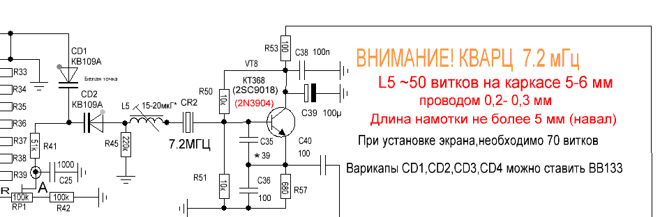 | Quote (artemx) Никак не въеду че ему нада! ГУНы запускаются при любом состоянии синтезатора и не зависит от выбора диапазона.Не запускаются из-за слабого усиления транзисторов ss9018. Все таки отечественные КТ368, а еще лучше КТ342. Буквально случайно перебирая разные типы транзисторов, установил 2N3904 (писал выше). Так с ним в опорнике катушка и резистор перестраиваются в больших пределах, с одинаковыми варикапами КВ109 (белая точка). Последний собранный синтезатор был укомплектован 2N3904 с такой обвязкой: