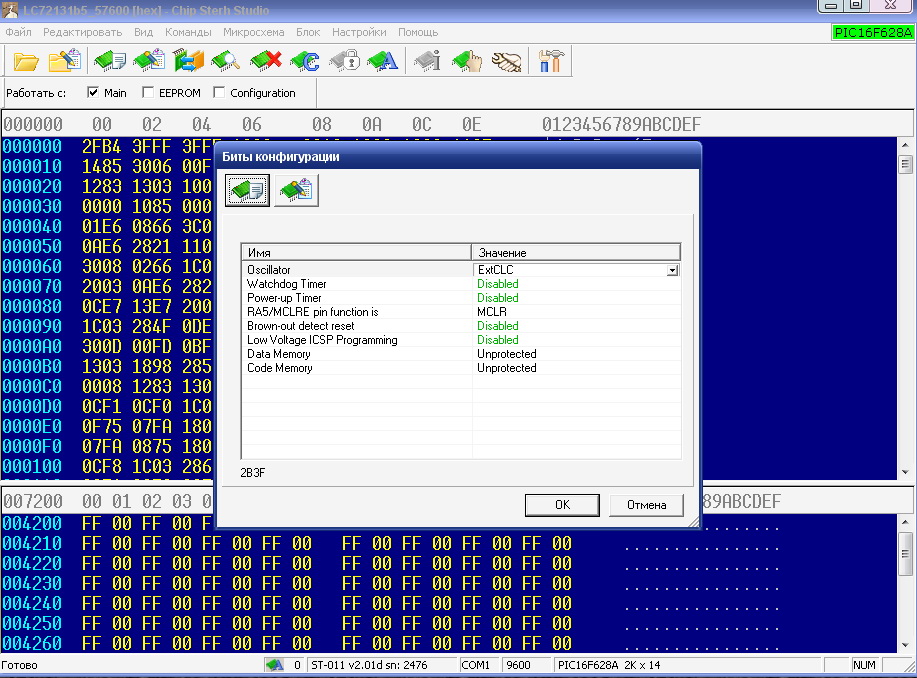 | ut3mk, Юрий PIC я прошил под 57600. А правильно ли я выставил конфигурацию контроллера? контрольная сумма получилась 2B3F. Посмотрите вложение, верно ли сделал?