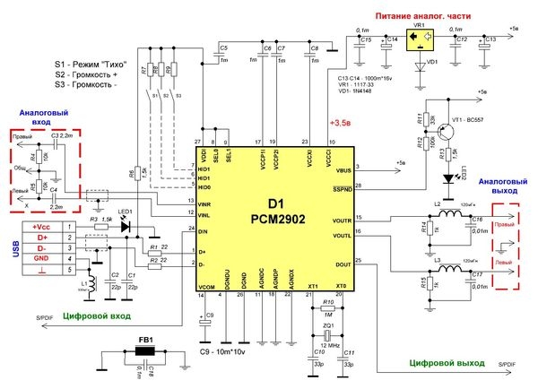 | Юра , а в принцепе почемуб не реализовать свой звуковой адаптер , к основной плате, или в основной плате ... Что то типа такого. http://www.overclockers.ua/peripheral/usb-sound-card/?print http://electronics-lab.ru/blog/audio/122.html http://el-shema.ru/publ/zvukovaja_karta_svoimi_rukami/1-1-0-241 И СДР былбы полным , и более ещё привлекательным, и людиб не заморачивались бы поиском звуковых карт , а имелиб встроенный свой звуковой адаптер , и продажыб возраслиб , и интерес бы к этому СДР бы возрос и подключение бы упростилось , два основных USB подключения и два для микрофон и телефон ..... Юра прошу мою мысыль в штыки не воспренимать , это лиш предложение , и мысли в слух.... Потомучто купить достойную звуковую , это 1000-4000 и болие.. гривень . Подумайте....Можна предусмотреть , подключение разймов между плат ... на четыри USBишные... для дополнительной платы , звуковой карты... как дополнительный блок к СДР трансиверу... И предлагаю расмотреть , или разработать схему , чтобы стиковать ОСНОВНУЮ плату, с собственной звуковым адаптером ....